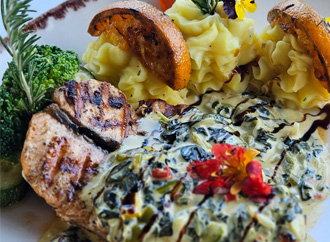 GRILLED SALMON Contents: Served with creamy spinach sauce and mashed potato and vegetables. Price: 610 TL