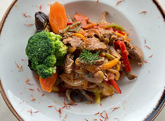 MEDITERRANEAN KEBAB Contents: Jullienne cut beef, shoestring potato, fresh vegetables, tomato sauce Price: 695 TL